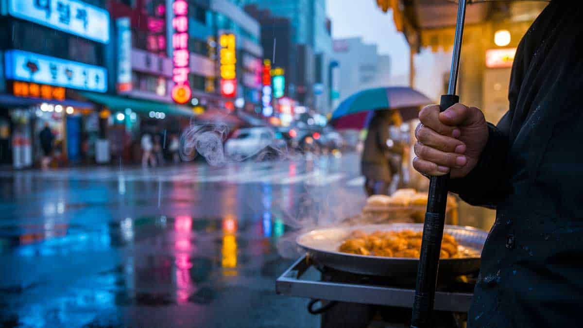 Away from major sites, Seoul reveals itself through small, unplanned moments. Sidewalks become waiting rooms, food stalls, parking spaces, or meeting points. During the rainy season, people walk through heavy downpours without urgency, letting the city set the pace.